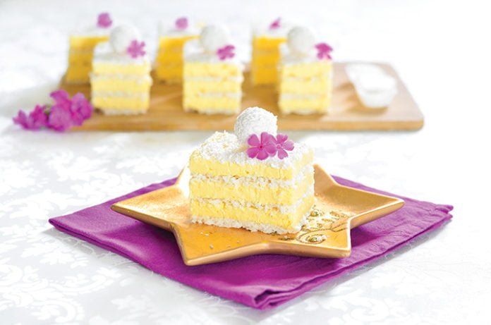- Slagati na svaki biskvit trećinu kreme, a na zadnji sloj kreme posuti kokosovog brašna.